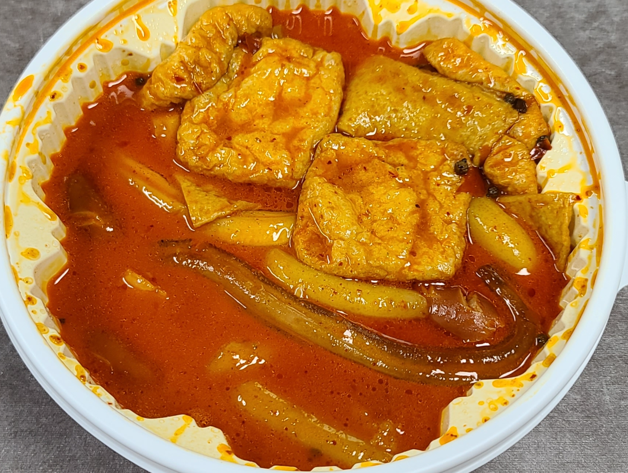 마라떡볶이 뚜껑을 열자마자 매운 냄새가 거실 가득 퍼지며 눈이 따끔거릴 정도였는데요. 시뻘건 국물의 비주얼이 먹기 약간 무서울 정도의 느낌을 주었습니다. 하지만 마라향과 커다란 유부와 분모자를 보니 얼른 먹어보고 싶어 입 안에 군침이 슬슬 돌기 시작했습니다.