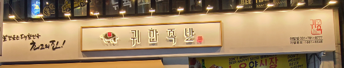 현란한 네온사인 가득한 야탑동 먹자골목 가운데에 깔끔한 간판으로 눈에 들어오는 "귀한 족발" 간판이 보입니다. 입간판에 보이는 메뉴들도 상당히 먹음직스러워 보이는 게 얼른 들어가서 주문해야겠네요.