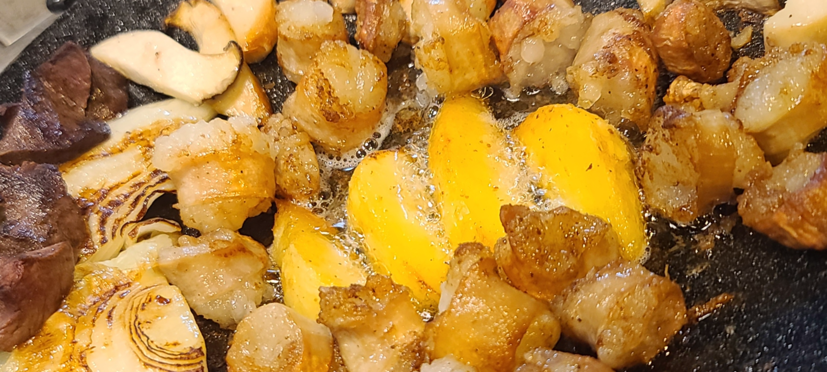 5분 정도 기다린 뒤 너무너무 맛있게 구워진 "소대창구이와 염통구이"입니다. 기름이 쫙 빠져 "꼬들꼬들 고소한 맛"이 일품인 "소대창구이"와 "쫄깃쫄깃 부드러운 맛"이 환상적인 "염통구이"는 정말 소주를 안 마시면 후회할 정도로 최고의 맛이네요. 야무지게 기름을 먹어 노릇노릇 잘 익은 양파와 감자 그리고 버섯과도 함께 먹으니 스트레스가 사라질 정도로 세상 "꿀맛"입니다.