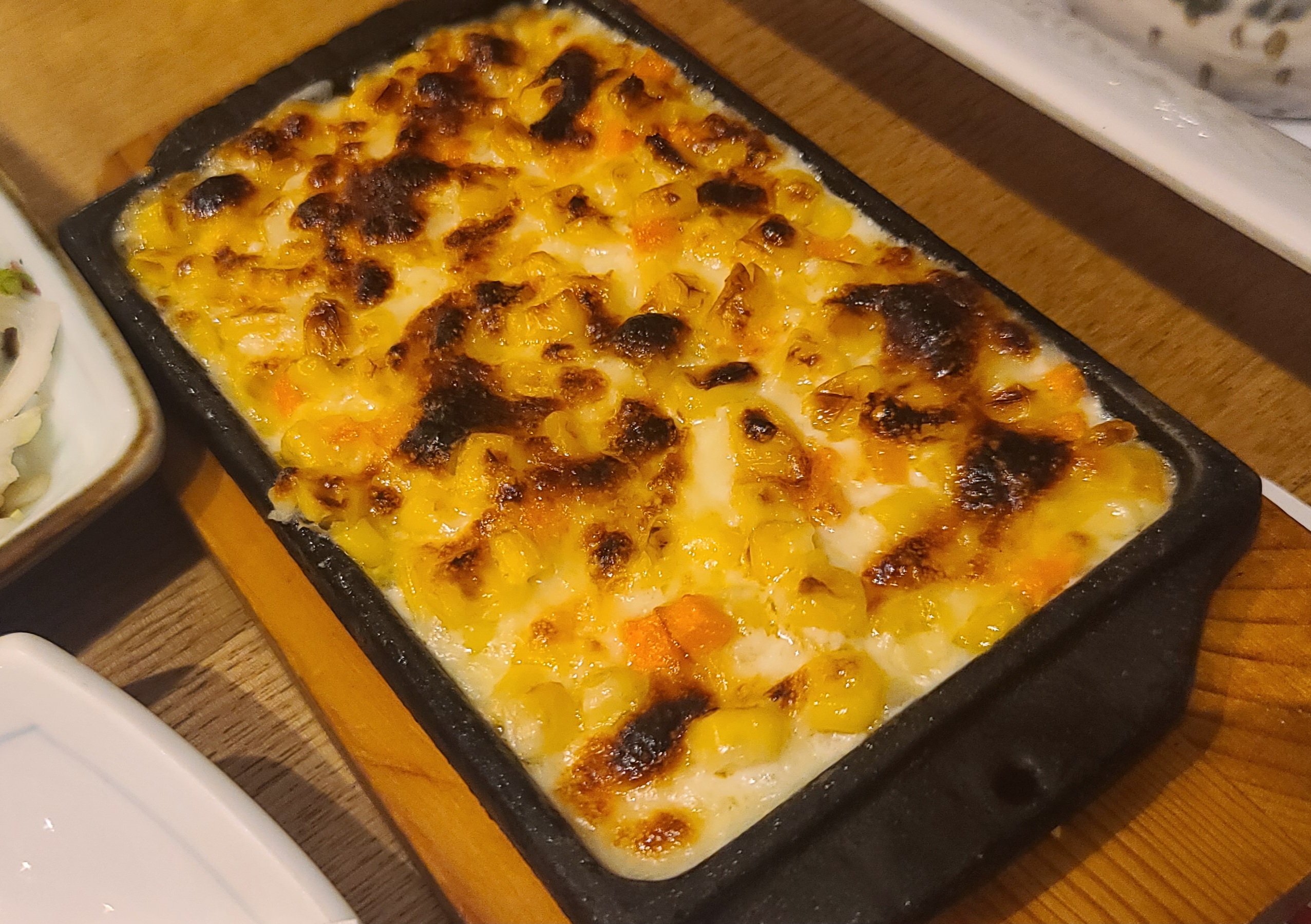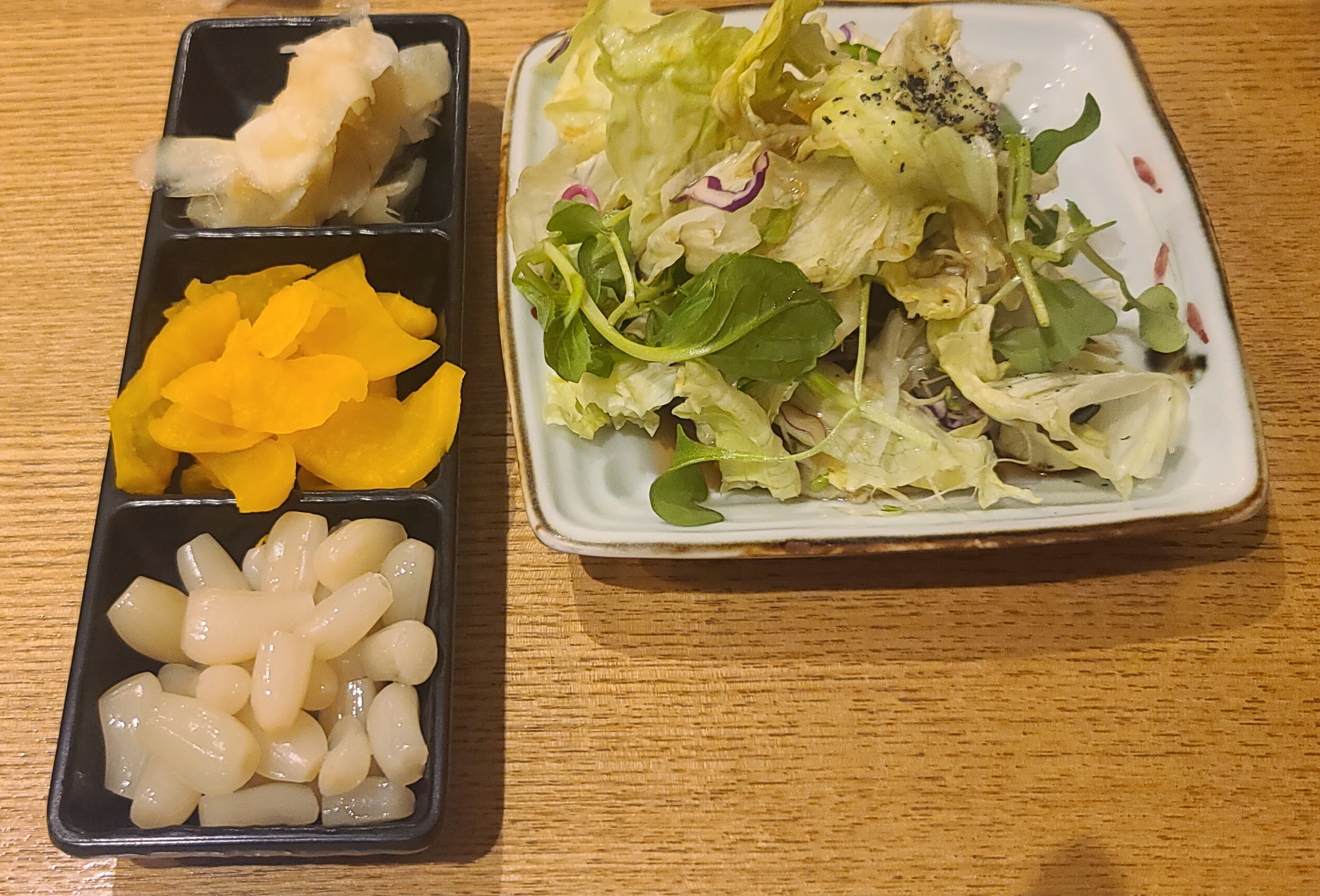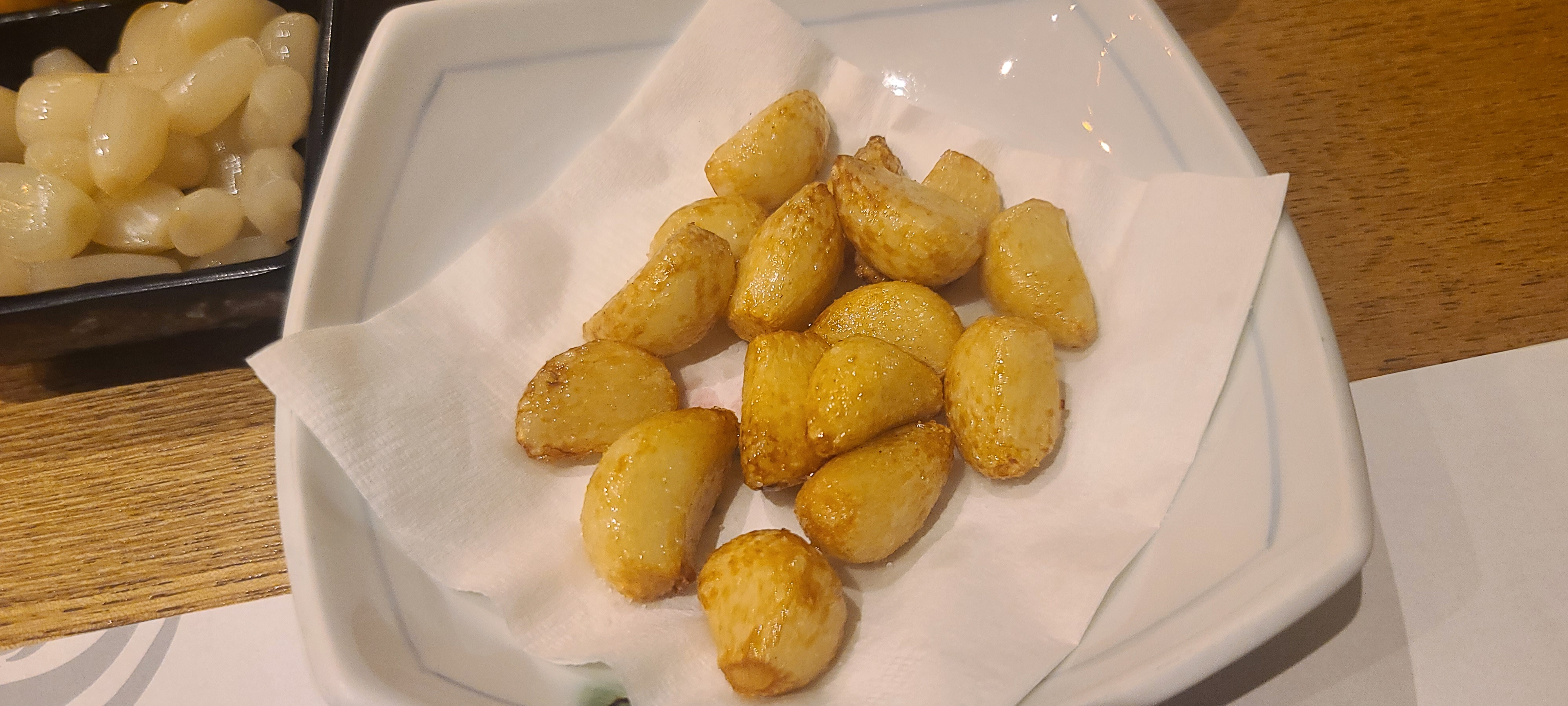 "진참치"의 "기본반찬"입니다. "샐러드", "구운 마늘", "콘버터" 등 입맛 돋우는 음식들이 참치회를 먹는 중간 하나씩 나와주네요.