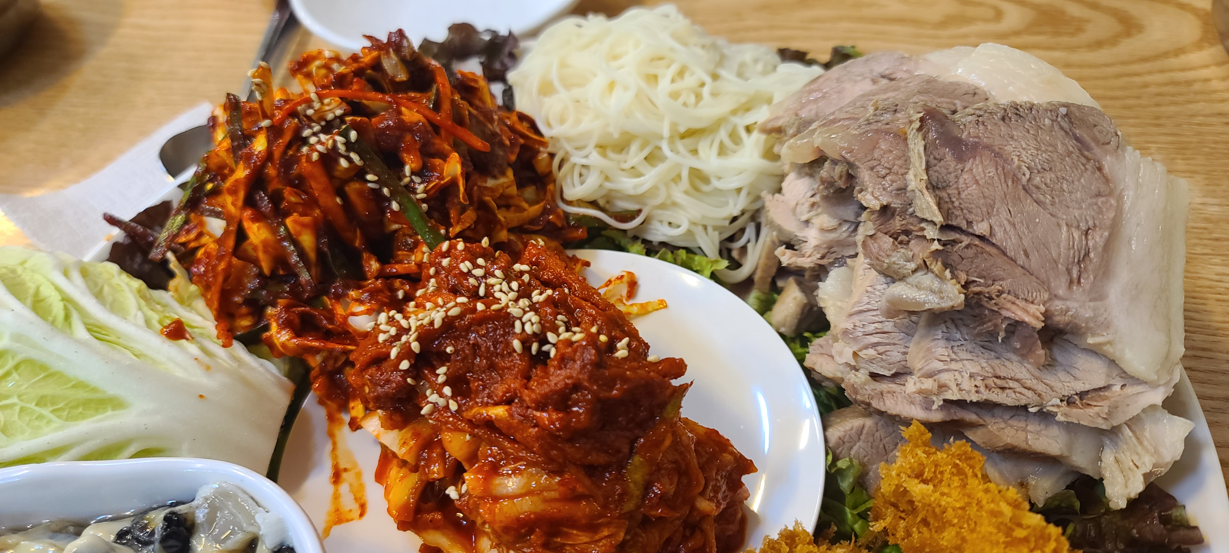 생각보다 빠르게 메인 메뉴인 "모둠스페셜" 나왔습니다. "푸짐한 보쌈 고기"와 함께 "비빔국수", "새우튀김"이 같이 나왔고요. 겨울에 꼭 먹어야하는 "생굴"도 한가득 나왔습니다. 바로 한쌈 먹어봐야겠죠?